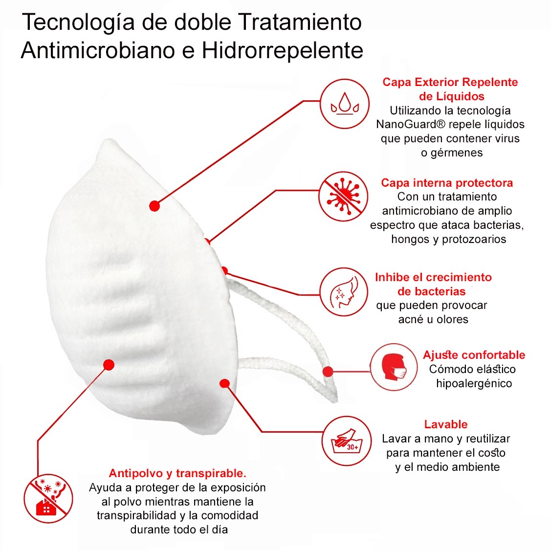 - Utilizando la tecnología NanoGuard® la capa exterior del barbijo repele los las microgotas que pueden contener gérmenes alejándolos de la superficie y, al mismo tiempo, mantiene una excelente permeabilidad al paso del aire.